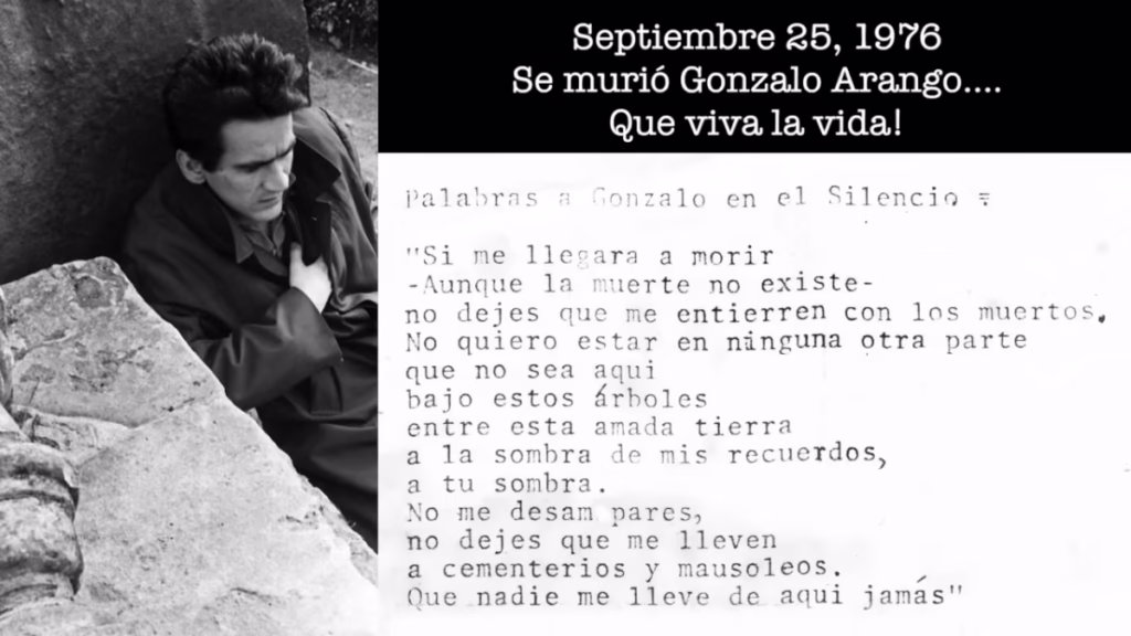 Algo que también me impactó y me enseñó otra lección sobre Gonzalo ocurrió cuando bajaban el féretro a la tumba: unos jóvenes a 20 metros de distancia comenzaron a gritar insultos contra Gonzalo y a protestar su abandono al movimiento nadaísta. Yo sentí rabia por lo que consideraba un irrespeto, y cuando los miraba con ojos ofuscados vi que mi madre también los miraba, pero no con rabia sino con ojos que casi sonreían. Comprendí entonces que ella sabía que Gonzalo sería el primero en sonreír